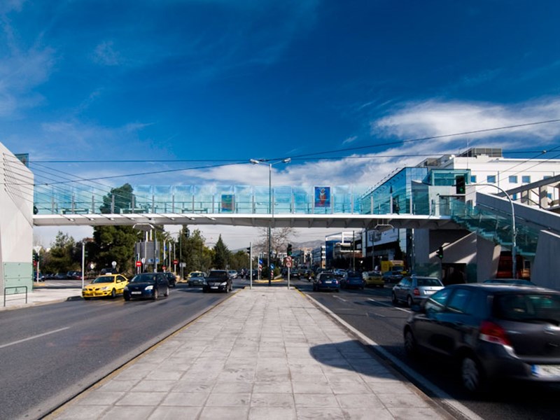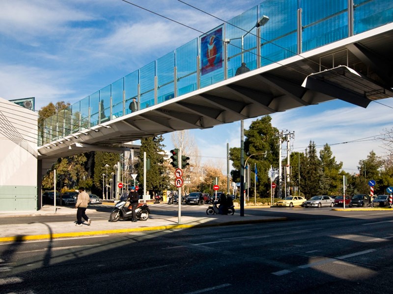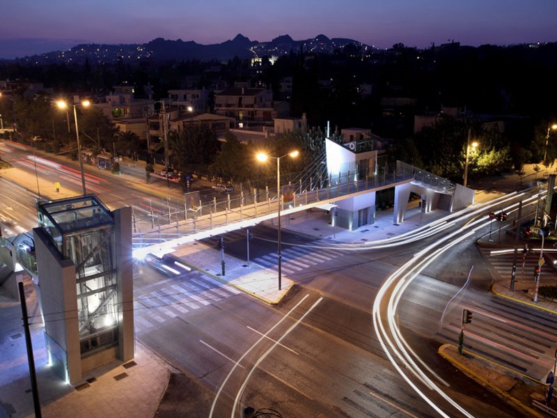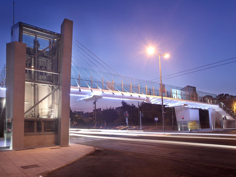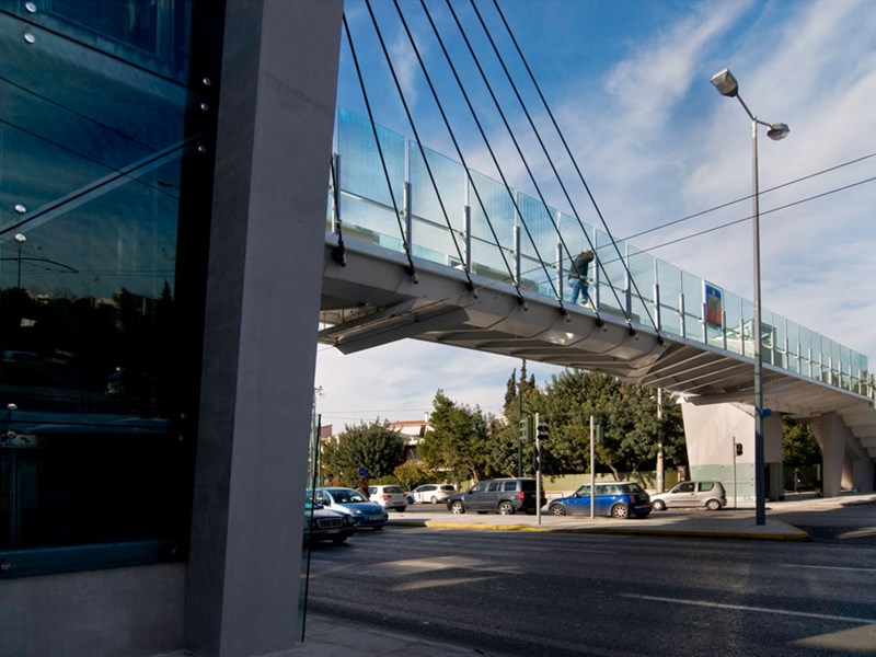 Construction of a composite cable- pedestrian bridge with its foundations, construction of two composite ramps, placement of escalators and four elevators inside the bridge’s pillars.
